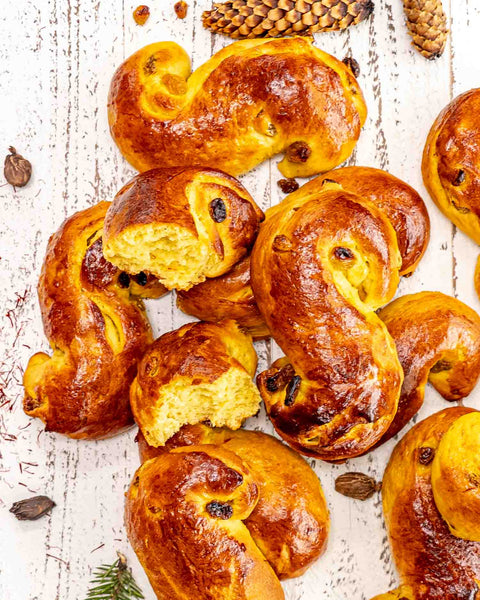 While lussekatter are the star, saffron has a life far beyond December 13th. Throughout Advent and Christmas, Swedes use saffron in cakes, cookies, festive breads, biscuits, and even in warm drinks. Saffron cakes (saffranskaka), chewy saffron cookies, and saffron-infused buns fill homes with comfort during holiday fika moments.