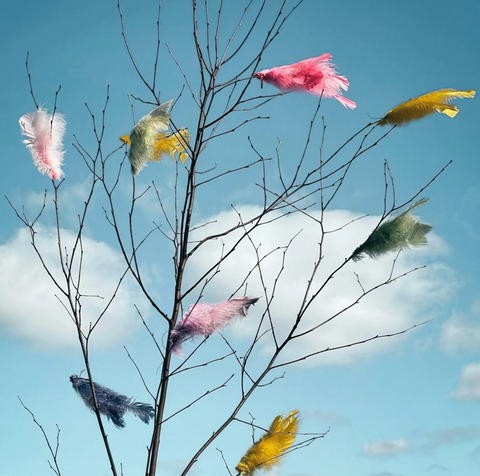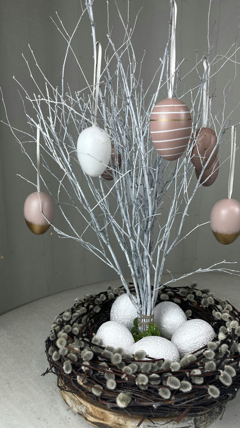 A few branches in a vase påskris decorated with soft, colorful feathers. Sometimes a couple of ornaments, maybe a hint of yellow somewhere in the room. That’s often enough. It’s usually placed by a window, where the natural light catches it during the day, making it feel alive without being overwhelming.